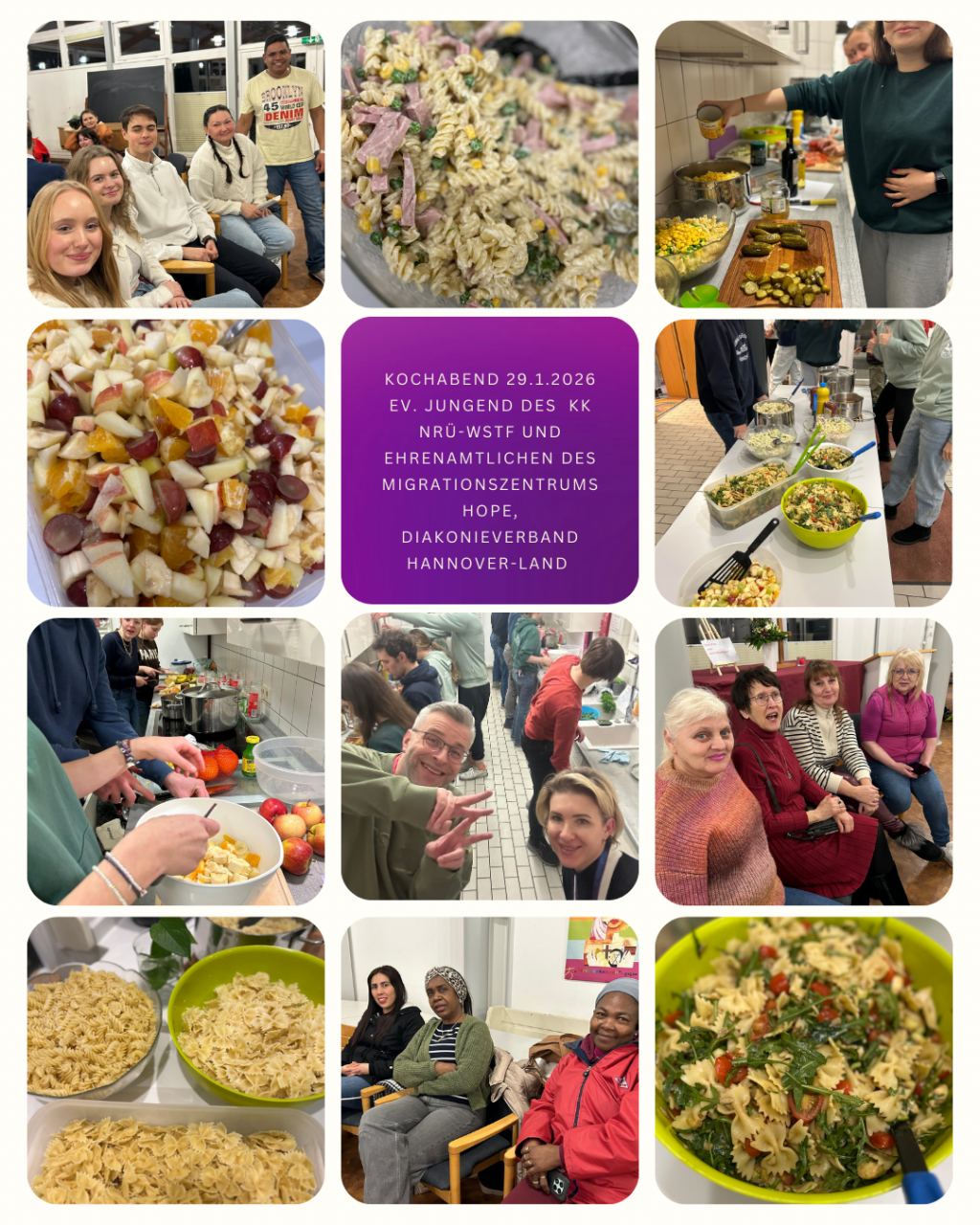 Teamerinnen und Teamer aus der evangelischen Jugendarbeit kamen zusammen mit Ehrenamtlichen des Migrationszentrums Hope/Diakonieverband Hannover-Land. Nachdem bereits köstliche Speisen aus der Ukraine und aus Kolumbien zubereitet wurden, gab es diesmal „typisch deutsch“ und jugendgerecht Nudelsalat und Obstsalat, bei deren Zubereitung viele Hände helfen konnten. Beim Schnippeln und Würzen und in kleinen Runden kamen